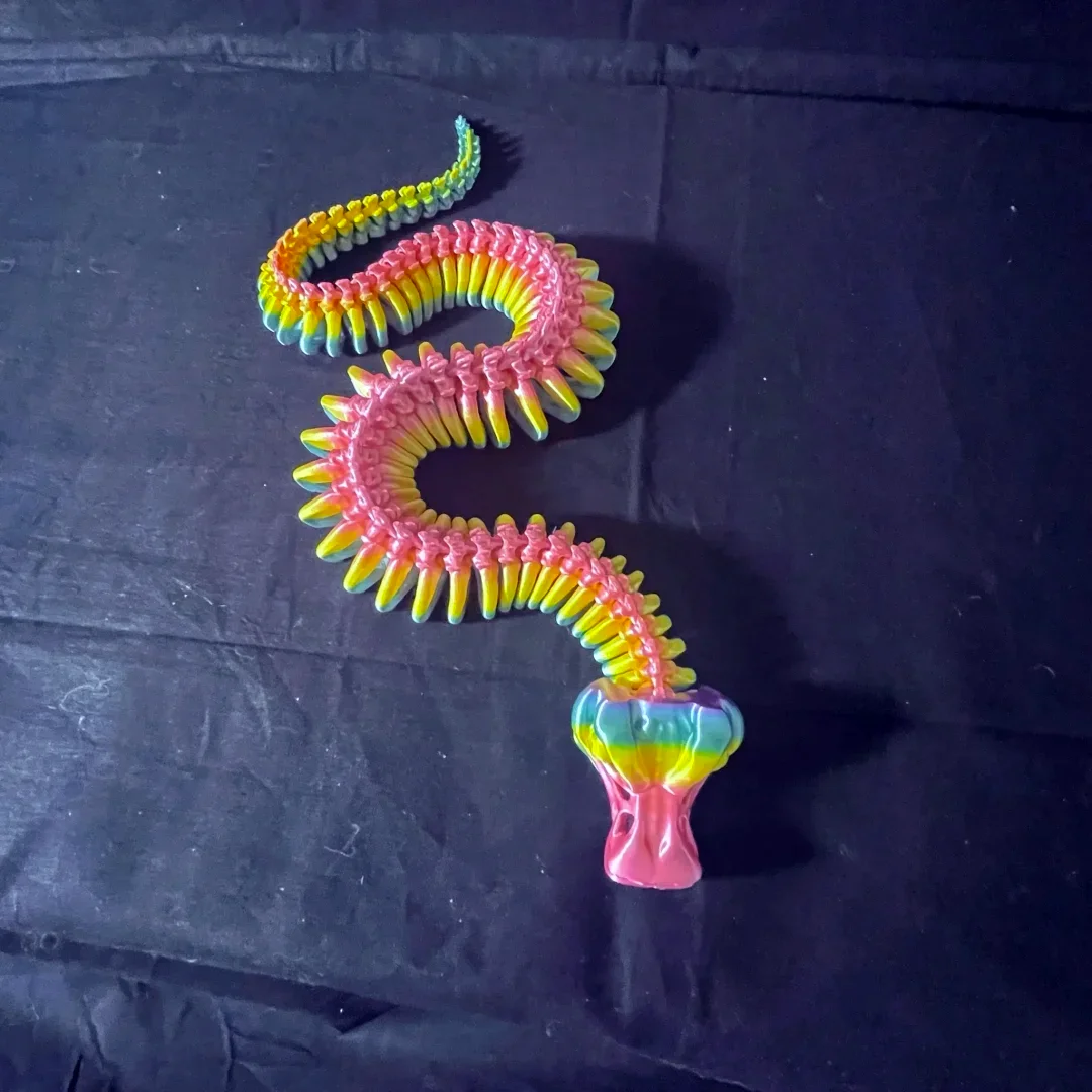 Experience the ultimate sensory relief with the 56cm Flexi-Viper Snake. This articulated snake is a 3D printed masterpiece in a rainbow 2 filament, designed to move with incredible fluidity. Perfect for focus, stress relief, and captivating display.