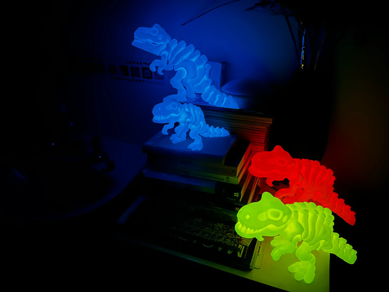 Family of Glow-In-The-Dark Articulated Flexi T-Rex 3D Printed Dinosaurs. What you get is:-